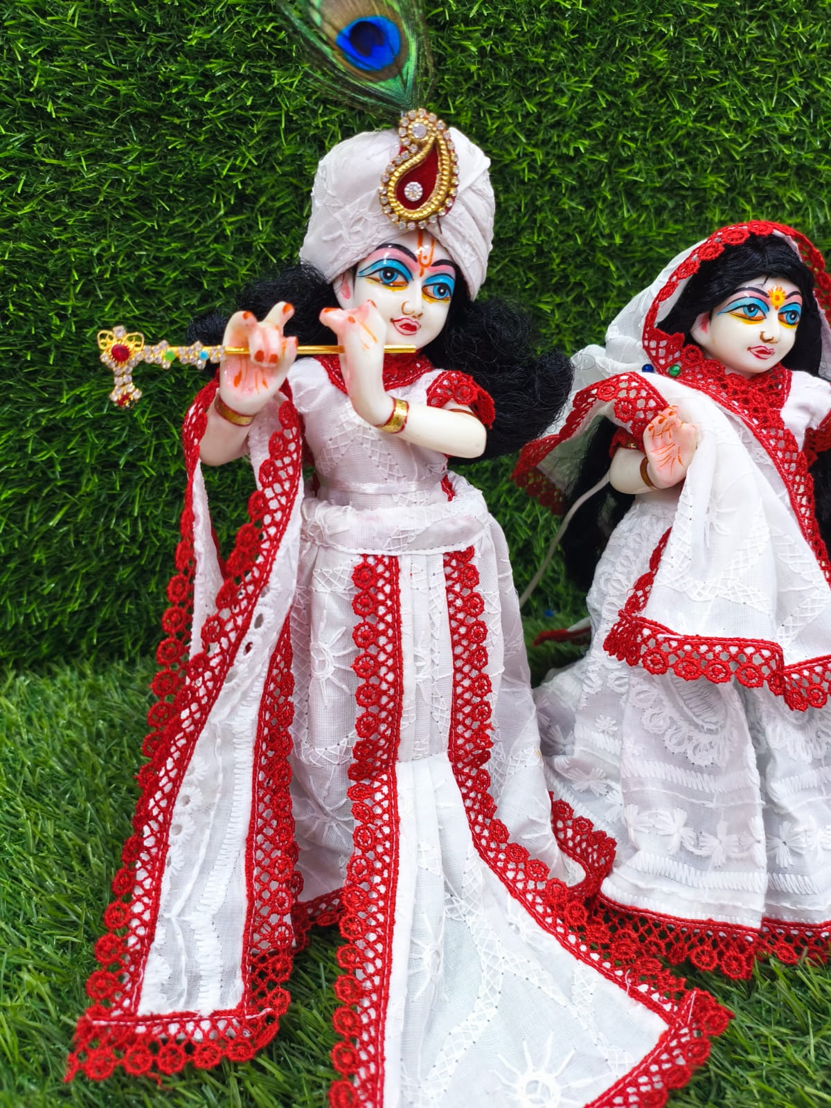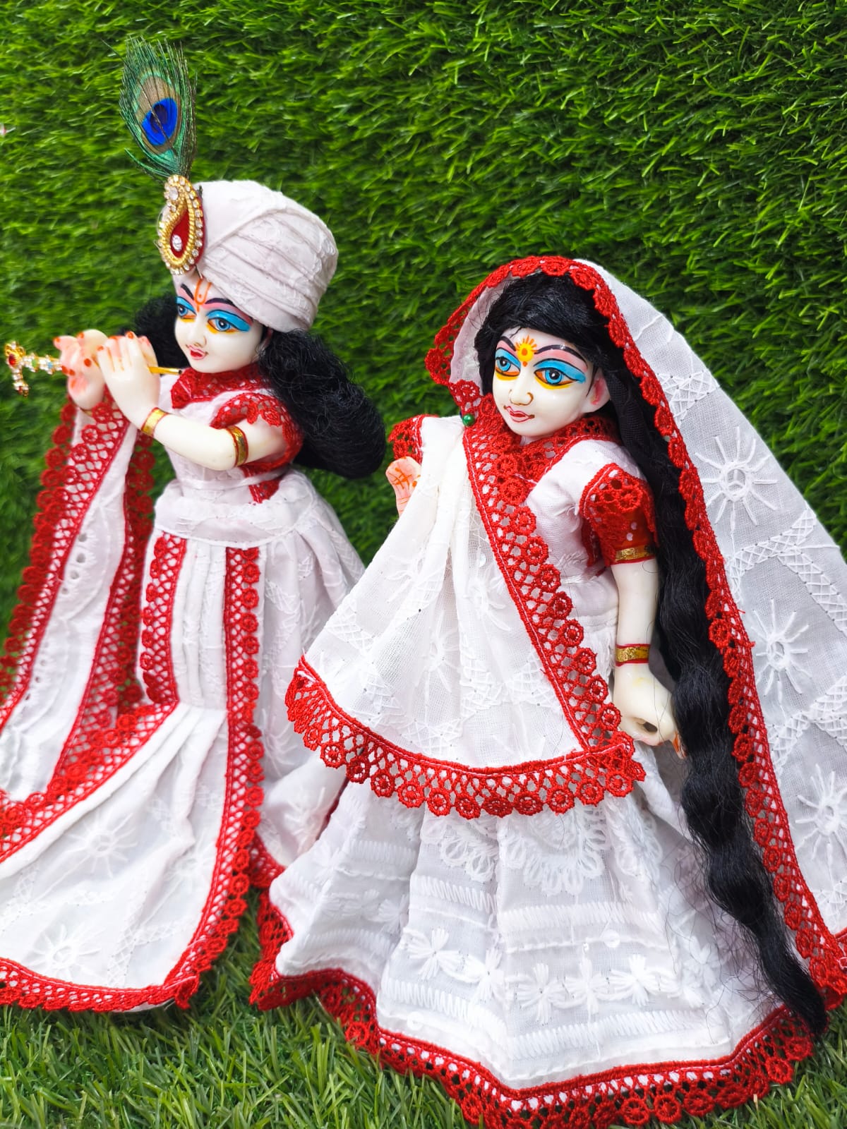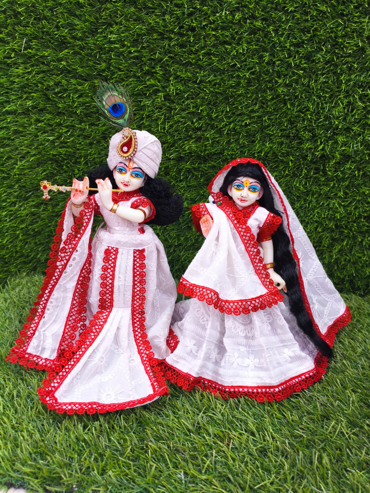 dicover the exquisite world of radharani,krishna dress also known as/laxmi,narayana dress/these finely-crafted cotton poshaaks(attires)are not only a celebration of tradition but also a reflection of your devotion.available in various sizes from idol size 9″ to 18″.dresses are well designed,soft,washable,colour guarantee.